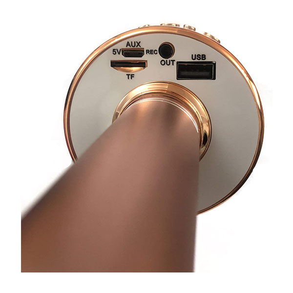 این میکروفون دارای خروجی USB و TF است که میتوان رم و فلش خود را به اسپیکر این میکروفون وصل کنیم و آهنگ گوش بدهیم.
