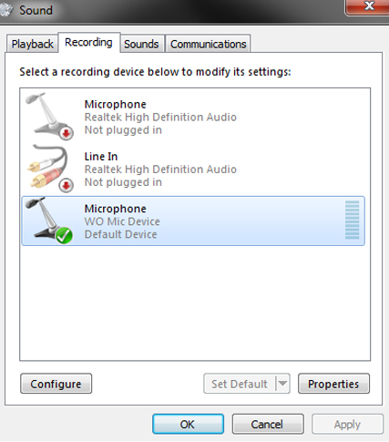 - در سربرگ Recording گزینه Microphone را انتخاب کرده و به عنوان پیش فرض قرار دهید.