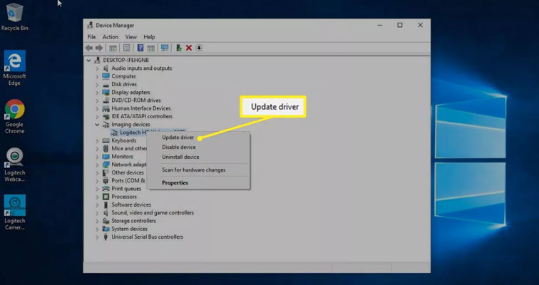 4- در صورت نیاز برای آپدیت درایور وب کم خود به Device Manager رفته و روی Cameras یا Imaging Devices کلیک کنید. در ادامه با کلیک راست روی webcam و انتخاب گزینه Update driver می توانید درایور های خود را به روز رسانی کنید.