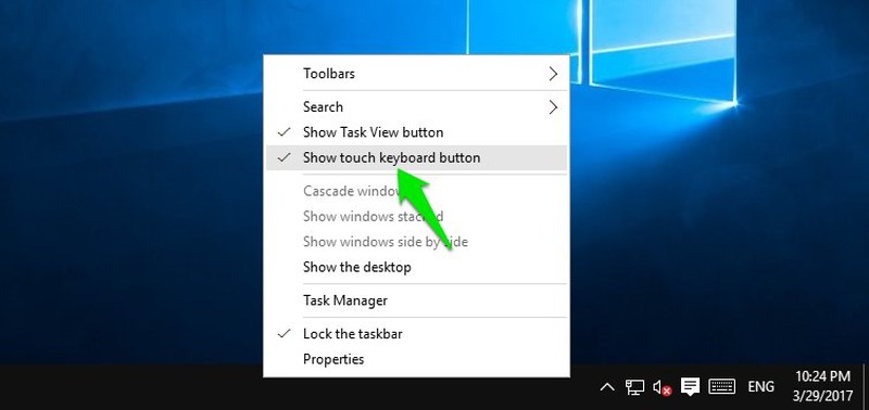 - بر روی Taskbar یا نوار وظیفه کلیک کنید و گزینه Show touch keyboard button را فعال نمایید.