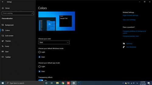 - در منوی باز شده Color را انتخاب کرده و دو بخش Change the default Windows mode و Change the default app mode را از Light به Dark تغییر دهید.