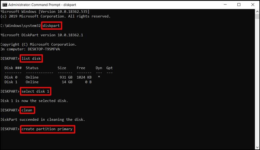 6- برای رفتن به مرحله بعد کلمه Clean را وارد کرده و اینتر را بزنید.