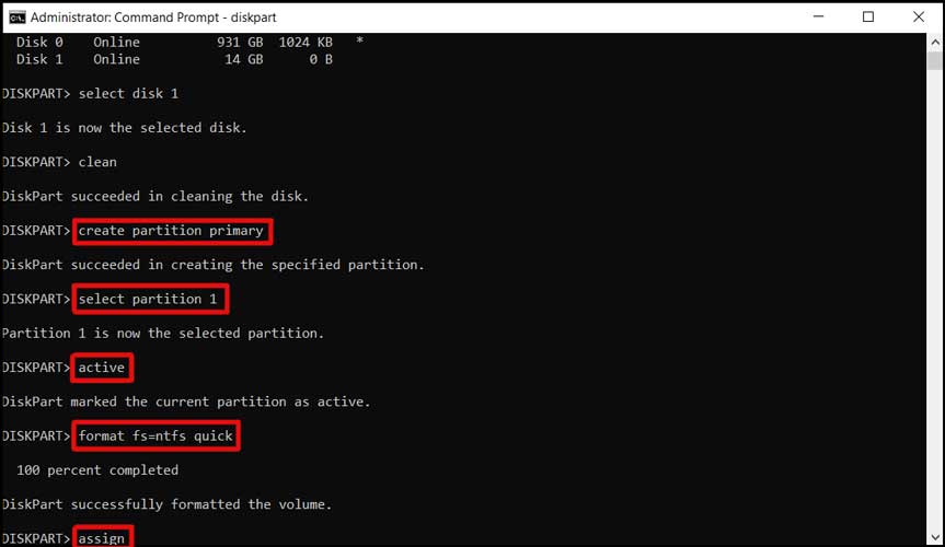 10- عبارت format fs=ntfs quick را وارد کرده، اینتر را بزنید تا فلش مموری شما فرمت شود.