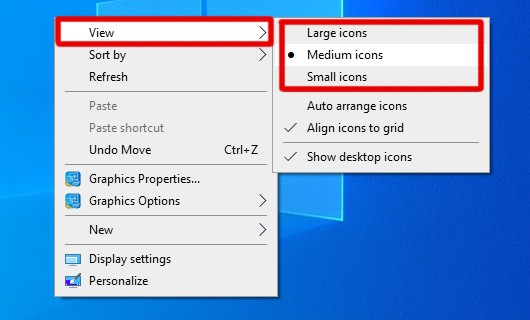 • روی فضای خالی دسکتاپ راست-کلیک کنید → View → یکی از گزینه‌های “Small icons”، “Medium icons” یا “Large icons” را انتخاب کنید.