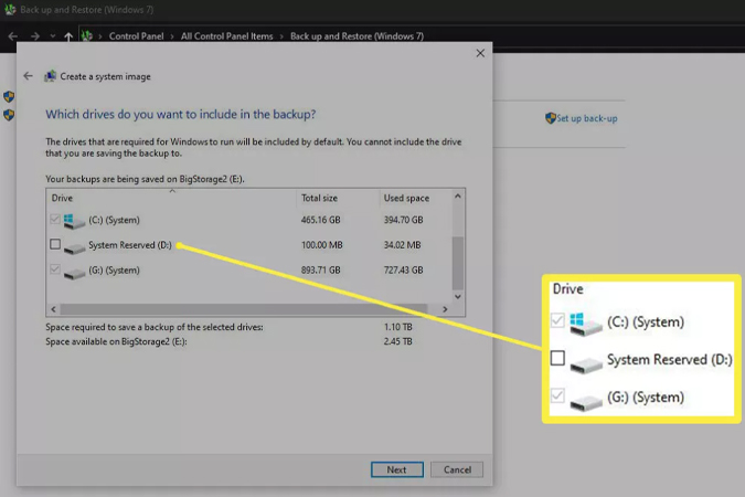 5- در این مرحله از نحوه بکاپ گرفتن از ویندوز 10 باید درایوی که می خواهید نسخه پشتیبان شما در آن ذخیره شود را انتخاب کرده و سپس روی Next کلیک کنید. همانطور که قبلاً نیز اشاره شد این درایو می تواند اکسترنال و یا اینترنال باشد.