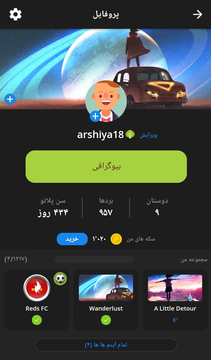 در این صفحه میتوانیم پروفایل، نام کاربری، بنر و بیوگرافی خود را تغییر دهیم. این صفحه تعداد دوستان، بردها، تعداد سکهها، آیتمهای بازی و سن شما در پلاتو را نیز نشان میدهد. در پایین صفحه به ترتیب مرحلهها و تعداد پیروزیها بازیها طبقه بندی شدهاند که میتوانید سطح خود را در هر بازی بسنجید.
