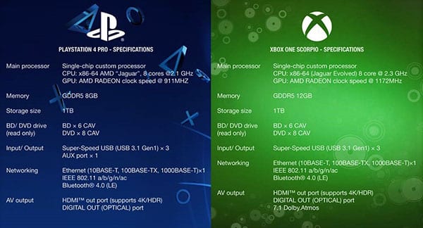 PS4 Pro و Xbox One X هر دو دارای پردازنده های هشت هسته ای AMD Jaguar هستند. با این حال، Xbox One X با سرعت 2.3 گیگاهرتز، از PS4 Pro با سرعت 2.1 گیگا هرتز، جلو تر است. Xbox One X از GPU سریعتری برخوردار است و دارای CPU بالاتری نسبت به PS4 Pro است. همچنین رم آن 12 گیگابایت است و در مقابل Ps4 که دارای رم 8 گیگابایتی است برتری دارد. اگر معیار اصلی شما هنگام انتخاب بین محصولات سونی و مایکروسافت، یعنی ایکس باکس یا پی اس 4، این است که کدام کنسول دارای مشخصات فنی قوی تری است، پس Xbox One X دستگاه مناسب برای شماست.
