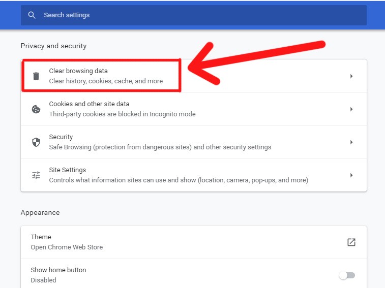 4- صفحه را اسکرول کنید و از قسمت Privacy and security بر روی گزینه Clear Browsing Data کلیک نمایید. (می توانید در قسمت Search Setting عبارت Cache را جستجو کنید)