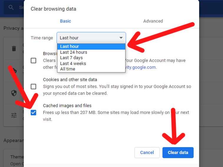 5- در بالای پنجره باز شده، از قسمت Time Range بازه زمانی مورد نظر خود را که می خواهید کش مرورگر در آن بازه حذف شود، انتخاب کنید. این بازه زمانی شامل 1 ساعت گذشته، روز گذشته، هفته گذشته، 4 هفته گذشته و در نهایت همه زمان هایی است که از گوگل کروم استفاده می کنید.
