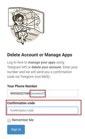 3- کدی به اکانت تلگرام شما ارسال خواهد شد که باید آن را در کادر Confirmation Code کپی کنید. در هنگام وارد کردن این کد باید حروف بزرگ و کوچک را رعایت و به درستی وارد کنید و در نهایت روی Sign In ضربه بزنید. همچنین اگر کد را دریافت نکردید بررسی کنید که شماره خود را بدرستی وارد کرده اید. در صورت اشتباه بودن شماره روی عبارت Incorrect کلیک کنید تا بتوانید آن را اصلاح کنید.