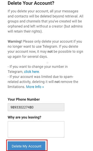 – تلگرام امکان حذف اکانت از طریق اپلیکیشن را در اختیار کابران خود قرار نداده است. شما فقط از با استفاده از سایت این شرکت که لینک آن در مرحله 1 از روش حذف اکانت تلگرام کمتر از یک دقیقه قرار داده شده است، می توانید اقدام به این کار نمایید.