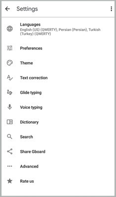 8- اکنون وارد صفحه تنظیمات کیبورد جدید شده اید، که می توانید از این طریق، تم، نوع نمایش کیبورد، قابلیت حدس کلمه و… را به دلخواه خود تنظیم نمایید.