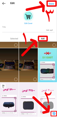 4- اکنون تب Add را باز کنید. در این قسمت سایر استوری هایی که تا کنون در پیج اینستاگرام خود منتشر کرده اید، مشاهده می کنید که باید یکی از آن ها را انتخاب کرده و سپس بر روی Done ضربه بزنید.