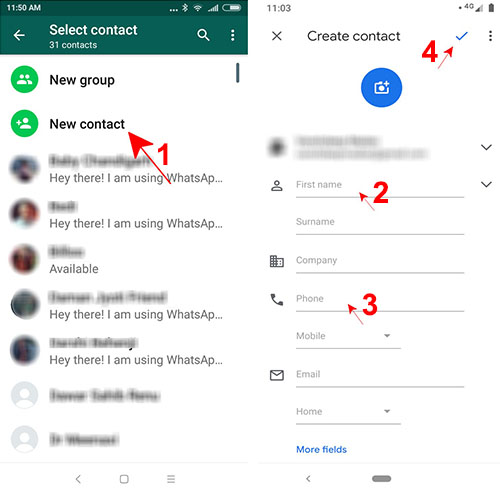 اگر شماره خود را در لیست مخاطبان داشته باشید می توانید در یک صفحه خصوصی به ذخیره پیام بپردازید. برای انجام اینکار می توانید از طریق دفتر تلفن و یا بخش New Contact واتساپ اقدام به ذخیره شماره خود نمایید. ایجاد مخاطب ساده ترین روش ارسال پیام برای خود در واتساپ می باشد. ذخیره شماره در دفتر تلفن هر موبایل بسیار ساده می باشد. برای ذخیره شماره از طریق واتساپ مطابق مراحل زیر عمل کنید.