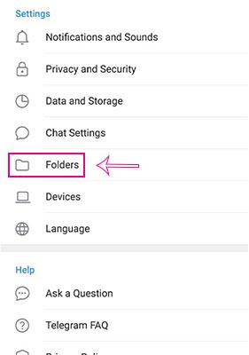 2- در ادامه برای آموزش پوشه بندی کانال ها در تلگرام باید پوشه ها یا Folders را باز کنید.