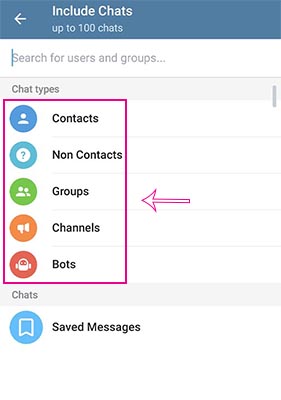 5- در ادامه با وارد شدن به بخش Add Chats می توانید بنا به سلیقه و نیاز خود پوشه بندی را ایجاد نمایید. می توانید تمام کانال های تلگرام خود را در یک دسته بندی قرار دهید. به همین ترتیب گروه ها، چت ها، ربات ها و حتی ترکیبی از این ها می تواند در یک دسته قرار گیرد. همچنین با جستجوی نام مخاطبان خود می توانید آن ها در دسته بندی مورد نظرتان اضافه نمایید. این دسته ها به صورت پیش فرض برای شما وجود دارند که کار شما را برای آموزش پوشه بندی کانال ها در تلگرام و همچنین گروه ها و … راحت می کند.