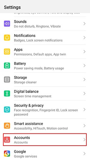 2- در ادامه گزینه Accounts را انتخاب کنید. اگر پیدا کردن آن برای شما مشکل است در بخش جستجو این کلمه را سرچ کنید.