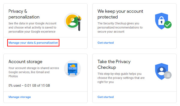 3- در این مرحله از روش حذف اکانت جیمیل، manage your data & personalization را باز کنید.