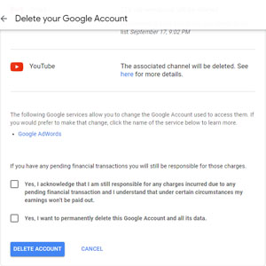 اما اگر قصد حذف اکانت خود را به طور کلی دارید باید مطابق مراحلی که در زیر گفته می شود عمل کنید. دقت داشته باشید که پس از انجام این مراحل به هیچ عنوان امکان دسترسی مجدد به اطلاعات خود را نخواهید داشت. همچنین دیگر نمی توانید اکانت جدیدی با همان نام بسازید. تمامی اکانت های شما که با استفاده از این حساب گوگل خود به آن وارد می شدید غیر فعال خواهند شد. پس قبل از انجام اینکار از تمامی موارد ذکر شده اطمینان حاصل کنید.