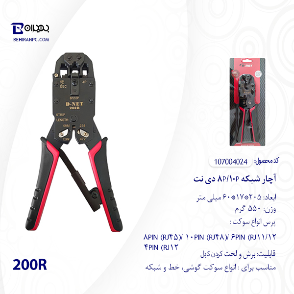 آچار شبکه دی نت مدل 200R یک ابزار حرفهای و کارآمد برای نصب و اتصال انواع سوکتهای شبکه و تلفن است. این آچار بهطور خاص برای قطع کردن، لخت کردن کابل و اتصال سوکتهای RJ45، RJ11، RJ48 و RJ12 طراحی شده و در پروژههای شبکه، مخابرات و حتی نصب خطوط تلفن بهخوبی کاربرد دارد.