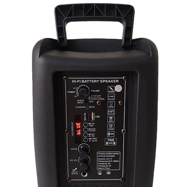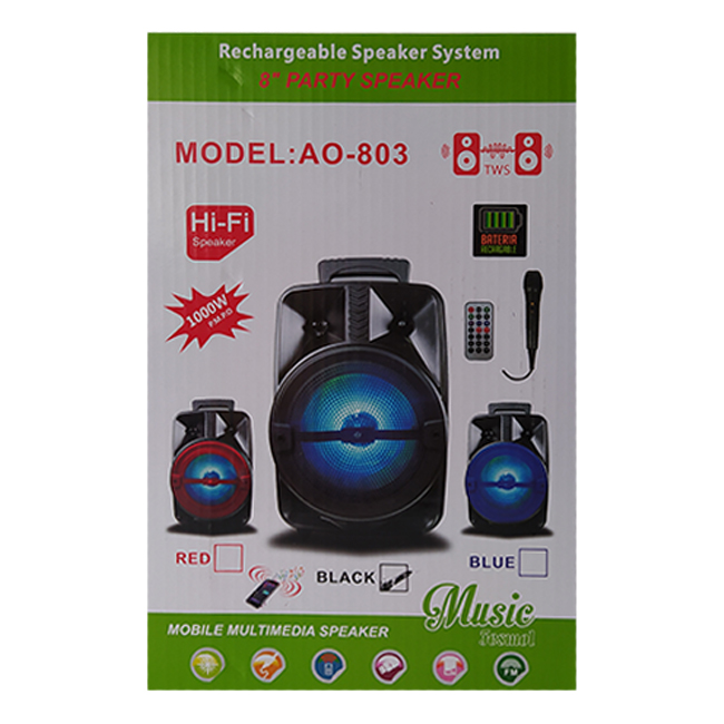 اسپیکر بلوتوث مدل AO-803 در ابعاد 18*22*36 سانتی متر و به شکل چمدانی طراحی شده که هنگام روشن شدن آن، نور RGB زیبایی مشاهده می شود. در قسمت پشت آن شاهد یک پورت USB، یک شیار کارت حافظه و یک درگاه 3.5 میلی متری برای اتصال فلش مموری، رم و کابل AUX هستید. همچنین این محصول از بلوتوث نیز پشتیبانی می کند.