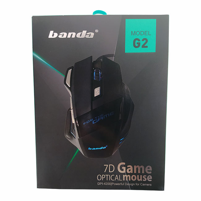 ماوس یکی از لوازم ضروری جانبی کامپیوتر و لپ تاپ می باشد که درمدل های بی سیم و وایرلس به بازار عرضه شده است. ماوس مخصوص بازی باندا مدل G2 از نوع با سیم می باشد و با پورت USB به کامپیوتر و لپ تاپ متصل می شود.