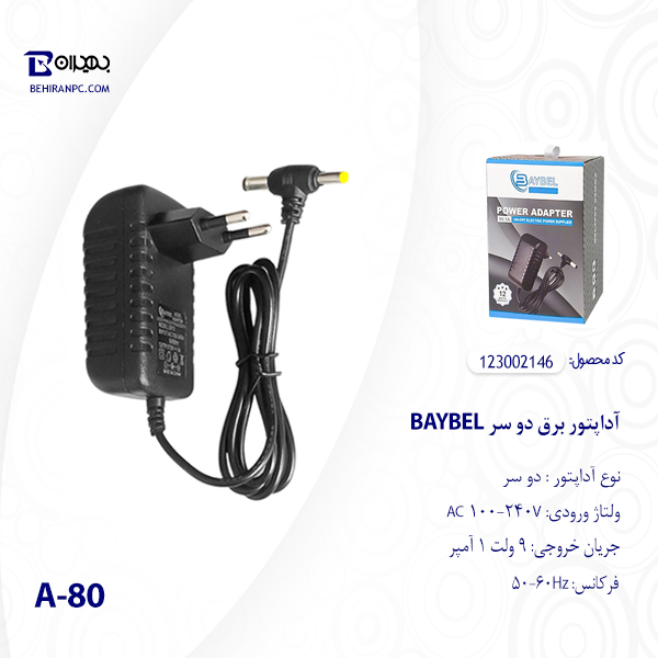 آداپتور برق دو سر 9 ولت ۱ آمپر BAYBEL مدل A-80 عدد