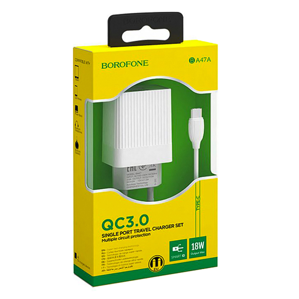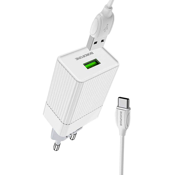 شارژر دیواری بروفون مدل BA47A به همراه کابل Type-C دارای درگاه ارتباطی USB و کابل همراه TYPE-C مناسب برای دستگاه های هوشمند دارای درگاه تایپ سی می باشد.