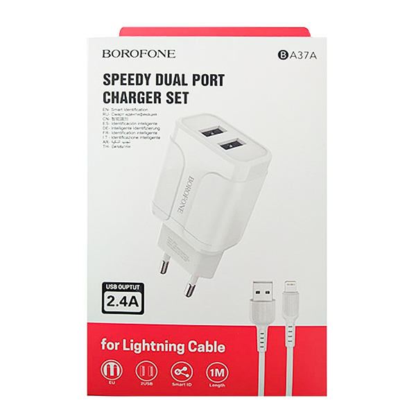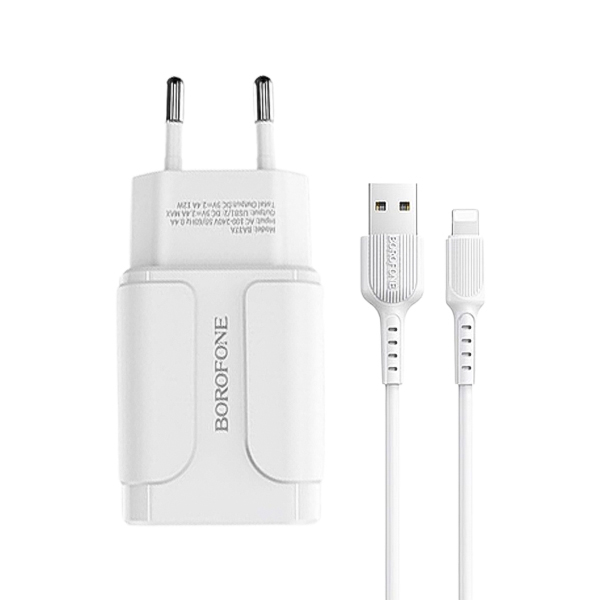 شارژر دیواری بروفون مدل BA37A به همراه کابل لایتنینگ یک گزینه عالی برای شارژ دستگاه های آیفون می باشد. این شارژر دیواری دارای دو پورت بوده و قادر خواهد بود دو موبایل را به صورت همزمان شارژ کند. دارای ولتاژ و شدت جریان 5V , 2.4A می باشد و طول کابل ان 1 متر می باشد.