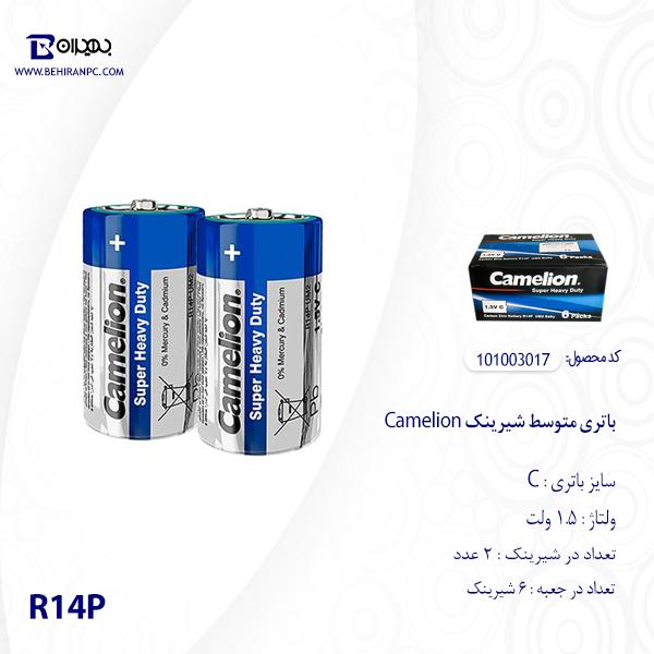 باتری متوسط Camelion مدل R14P با ولتاژ 1.5 ولت در بسته بندی 2 عددی تولید و عرضه می شود.