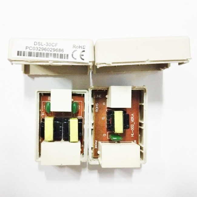 اسپلیتر دو بوبین دی لینک مدل DSL-30CF دارای ۳ پورت است که شامل ۲ پورت خروجی و یک ورودی دارد که از اختلال تلفن و ADSL یا اینترنت ثابت جلوگیری می کند. وظیفه این محصول جلوگیری از نویز هنگام استفاده از اینترنت است.
