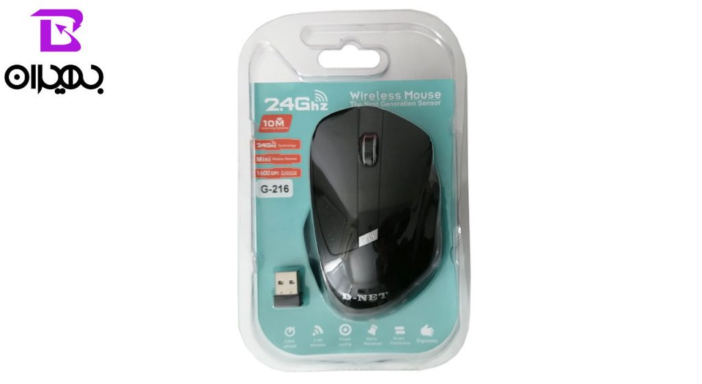ماوس بی سیم دی-نت مدل G-216 به صورت بی سیم و از طریق دانگل USB به کامپیوتر یا لپ تاپ متصل می شود. برد اتصال بی سیم این محصول 10 متر است و شما می توانید تا فاصله 10 متری از آن به صورت بی سیم استفاده نمایید. دقت این ماوس 1600dpi و حسگر آن اپتیکال می باشد. تعداد کلیدهای این ماوس 4 عدد است.