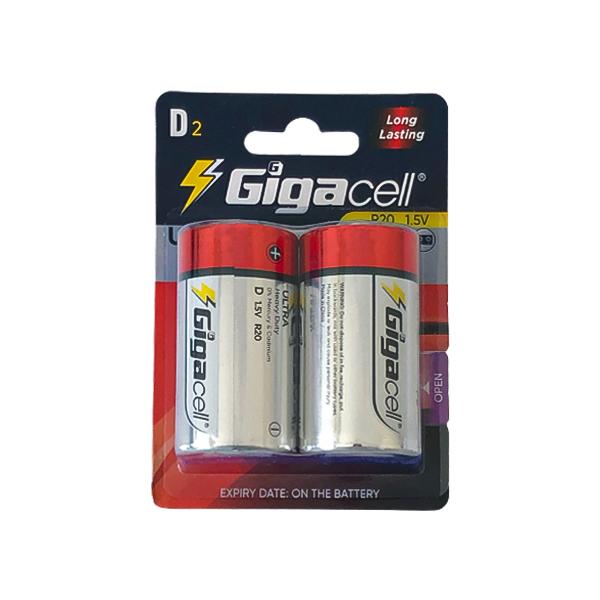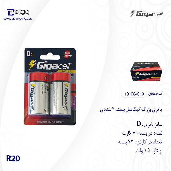 باتری بزرگ گیگاسل مدل R20 با ولتاژ 1.5 ولت در بسته بندی 2 عددی عرضه می شود.