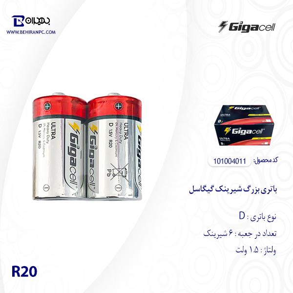 باتری بزرگ شیرینک گیگاسل مدل R20 با ولتاژ 1.5 ولت در بسته بندی 2 عددی عرضه می شود.