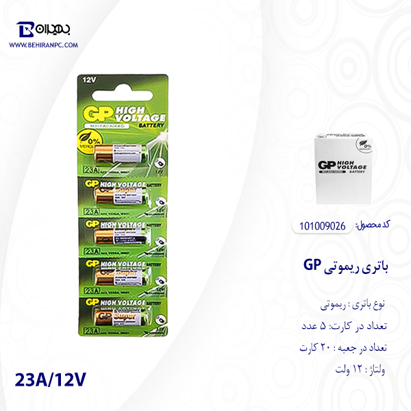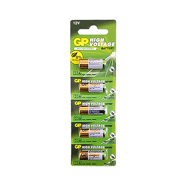 باتری 23A یک باتری ۸ سلولی با ولتاژ اسمی ۱۲ ولت است. باتری ریموتی GP یکی از انواع باتریهای با کیفیت و کاربردی است. باتری ریموتی GP مدل 23A با ولتاژ 12 ولت در بسته بندی 5 عددی در بازار عرضه می شود. همچنین از این باتری ریموتی 23A شما میتوانید برای ریموت کنترل، زنگ دربهای بیسیم، سیستمهای امنیتی (دزدگیر، مکان یاب)، اسباببازیها و … استفاده کنید.