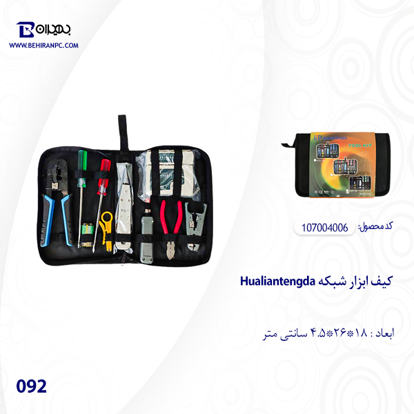 کیف ابزار شبکه Hualiantengda مدل 092 شامل یک عدد پیچ گوشتی دو سو، یک عدد پیچ گوشتی چهار سو، تستر شبکه، آچار شبکه، آچار استریپ، سیم چین، آچار پرس، ابزار پانچ، سیم لخت کن و باتری کتابی می باشد. این پک کامل ابزار، شما را از هر نوع ابزار دیگر بی نیاز می کند.