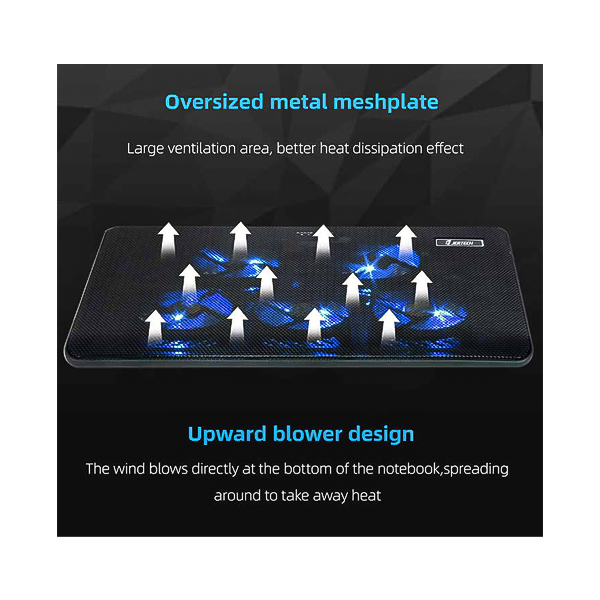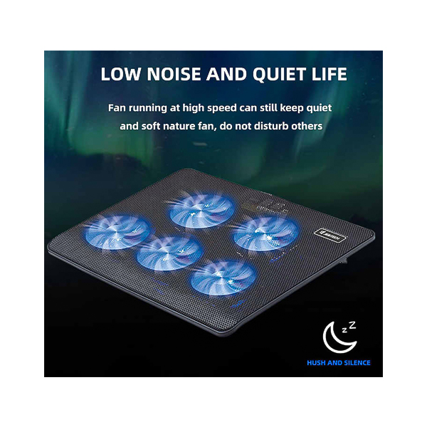 نورپردازی LED آبی رنگ که درون فنها تعبیه شده، ظاهری زیبا و مدرن به این پایه میبخشد و بهویژه برای محیطهای کاری، اتاقهای گیمینگ و استفاده در شب، جلوهای حرفهای ایجاد میکند. طول عمر فنها تا ۴۰,000 ساعت تخمین زده شده که نشان از دوام و کیفیت ساخت بالای این محصول دارد. همچنین با وزنی تنها ۵۸۹ گرم و ابعاد استاندارد ۳۶۰x۲۶۱x۱۷ میلیمتر، حمل و جابجایی آن بسیار ساده است.