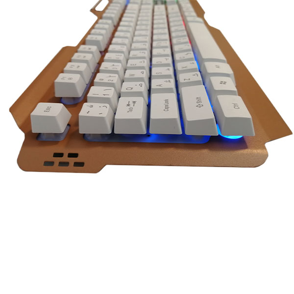 کیبورد این مجموعه دارای 104 کلید با طراحی مکانیکال است که علاوه بر حس عالی هنگام تایپ، عمر مفید بالایی تا 8 میلیون بار ضربه دارد. حروف فارسی حکشده روی کلیدها نیز استفاده روزمره و تایپ فارسی را آسانتر میکند. بدنه ترکیبی از پلاستیک ABS و صفحه فلزی داخلی (iron plate) است که به کیبورد استحکام بیشتر و وزن مناسب میدهد.