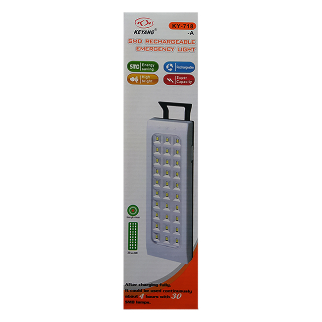 چراغ اضطراری کیانگ مدل KY-718 دارای 30 لامپ SMD با قدرت نوردهی بالا است که می تواند تا 4 ساعت روشن بماند. این چراغ را می توان به دو صورت دستی و آویزی استفاده نمود.
