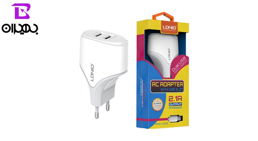 شارژر و کابل تبدیل USB به MicroUSB الدینیو مدل A2268 با دو پورت خروجی می تواند همزمان 2 دستگاه شما که مجهز به درگاه MicroUSB می باشد را شارژ کند. شدت جریان خروجی این شارژر 2.1 آمپر بوده و مناسب شارژ موبایل و تبلت می باشد. این شارژر از جنس پلاستیک ABS و دوشاخه آن متناسب با پریز های برق ایران است.