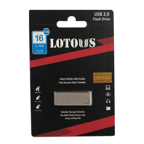 فلش مموری 16گیگابایت لوتوس مدل L-704 یک فلش با ویژگی های ضد آب، ضد لرزش، و مقاوم در برابر گرد و غبار است که می توانید تا 16 گیگابایت، اطلاعات در آن ذخیره کنید. جنس این محصول فلزی بوده و بسیار مقاوم است.
