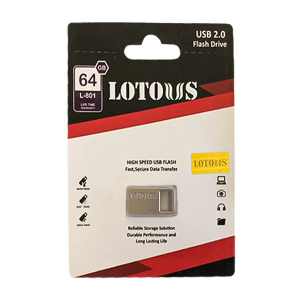 فلش مموری 64G لوتوس مدل L801 یک فلش ساده با ظرفیت 64 گیگابایت است، این فلش مموری در برابر آب، گرد و غبار و شوک و لرزش مقاوم است.