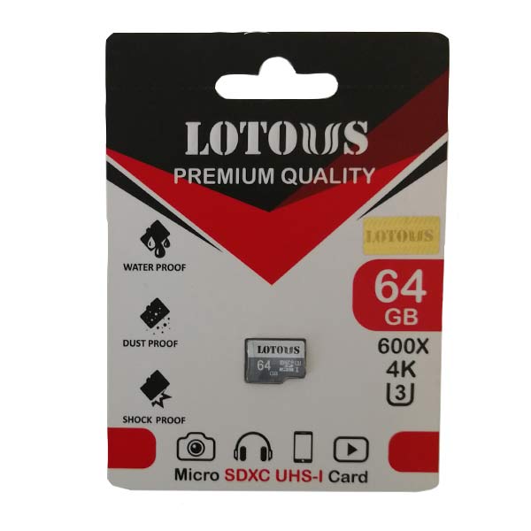 کارت حافظه 64G لوتوس مدل Micro U3 600X برای تمامی موبایل ها و دستگاه هایی که شیار کارت حافظه MicroSD دارند و تا حافظه 64 گیگابایت را پشتیبانی می کنند، مناسب است. این کارت حافظه در برابر آب، ضربه و گرد و غبار مقاوم می باشد.