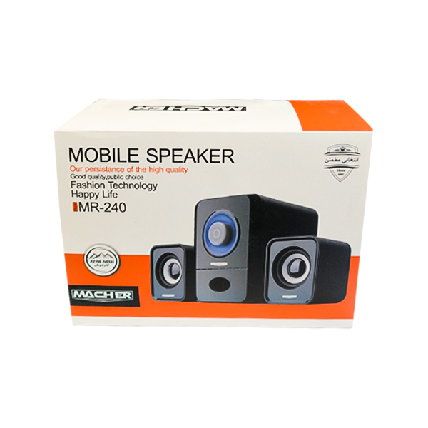 اسپیکر MR-240 سه تکه محصولی از شرکت مچر می باشد که از نوع رومیزی تولید و عرضه شده اند و در کنار کامپیوتر و لپ تاپ کاربرد دارد. اسپیکر بزرگ MR-240 توان 5 وات و دو اسپیکر کوچک MR-240 توان 3 وات و 2 آمپر قابلیت اتصال به کامپیوتر، لپ تاپ، موبایل، MP3/4، DVD و آیپد را دارند. اسپیکر سه تکه مچر مدل MR-240 دارای ورودی جک 3.5 میلی متری صدا و بلوتوث می باشد. محدوده فرکانس در این اسپیکر معادل 20 تا 90 هزار هرتز با حساسیت به نویز 70 دسی بل است.