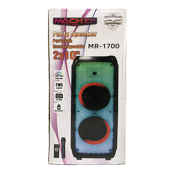 این اسپیکر قابل حمل که بصورت چمدانی می باشد با دو ساب ووفر به ابعاد 10اینچ مناسب برای پخش موسیقی در خانه و مجالس کوچک می باشد و از طریق بلوتوث به دستگاه ای اطراف خود وصل می شود. رقص نور، قابلیت ضبط صدا، پشتیبانی از FM Radio, TF CARD, USB,TWS, BLUETOOTH, AUX از دیگر مشخصه های اسپیکر مچر مدل MR-1700 است.