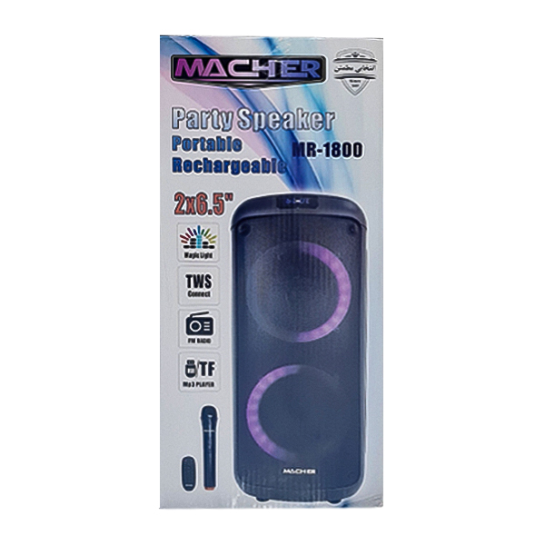 اسپیکرهای پارتی باکس مناسب برای پخش موسیقی در مجالس و فضاهای نسبتا بزرگ می باشد. اسیکر پارتی باکس MR-1800 مچر با ابعاد 54 سانتی متر به راحتی قابل حمل می باشد.