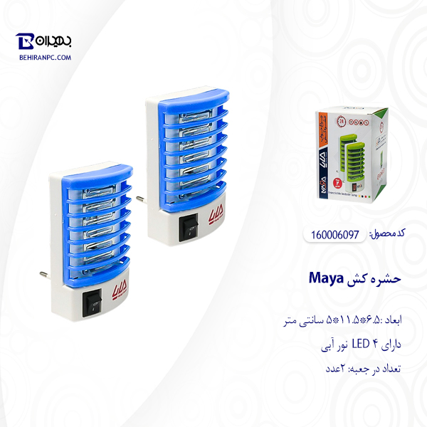 حشرهکش مایا در بستهبندی دوتایی، راهکاری مؤثر، کممصرف و بهداشتی برای از بین بردن حشرات مزاحم در فضاهای بسته مانند خانه، محل کار، هتل و مسافرخانهها است. این محصول با ابعاد مناسب 5 در 11.5 در 6.5 سانتیمتر طراحی شده و بهراحتی در هر پریز برق قابل نصب است، بدون اینکه فضای زیادی اشغال کند یا نیاز به نصب خاصی داشته باشد.