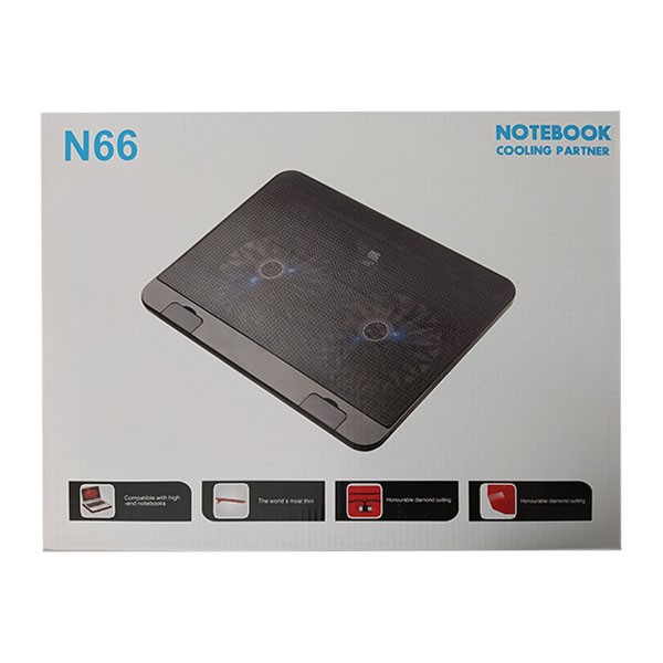 پایه خنک کننده لپ تاپ مدل N66 دارای 2 عدد فن بزرگ بوده که در دقیقه 1200 دور می چرخد. قطر این فن ها 14 سانتی متر می باشد و می تواند به سرعت لپ تاپ شما را خنک کند. این کول پد قابل تنظیم در 2 ارتفاع می باشد و با استفاده از نگهدارنده هایی که روی آن طراحی شده است مانع سر خوردن لپ تاپ شما می گردد.