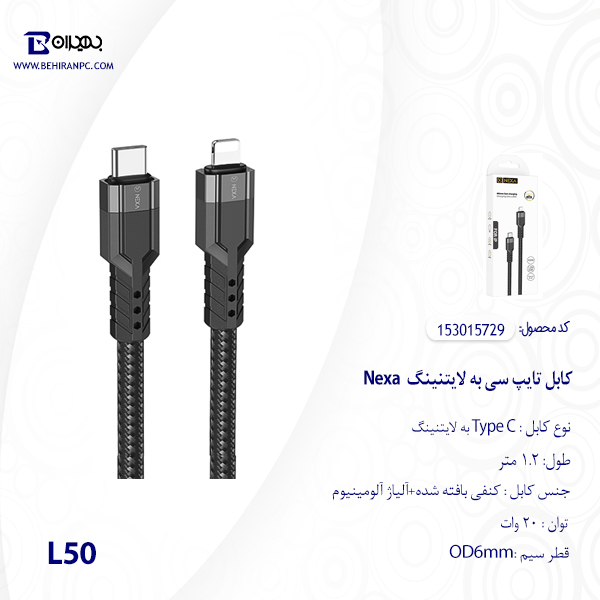 کابل تایپ سی به لایتنینگ Nexa 20W PD مدل L50 طول 1.2 متر عدد