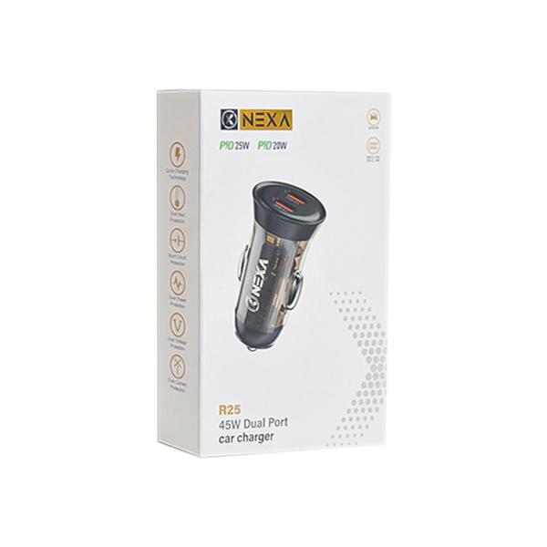 شارژر فندکی Nexa مدل R25 با توان 45 وات یک انتخاب کاربردی و قدرتمند برای افرادی است که میخواهند هنگام رانندگی، گوشی موبایل، تبلت یا سایر گجتهای خود را با سرعت بالا شارژ کنند. این مدل دارای طراحی بدنه شفاف و مدرن است و با ابعاد 27×55 میلیمتر و وزن سبک 24 گرم، بهراحتی در فضای فندکی خودرو قرار میگیرد بدون اینکه مزاحم سایر تجهیزات خودرو شود.